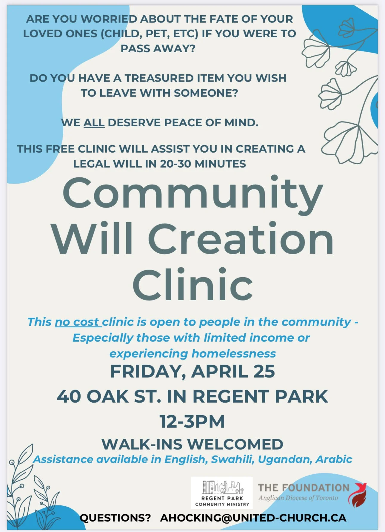 Are you worried about the fate of your loved ones (child,pet,etc) if you were to pass away? This free clinic will assist you in creating a legal will in 20-30 minutes. This no cost clinic is open to people in the community especially those with limited income or experiencing homelessness.